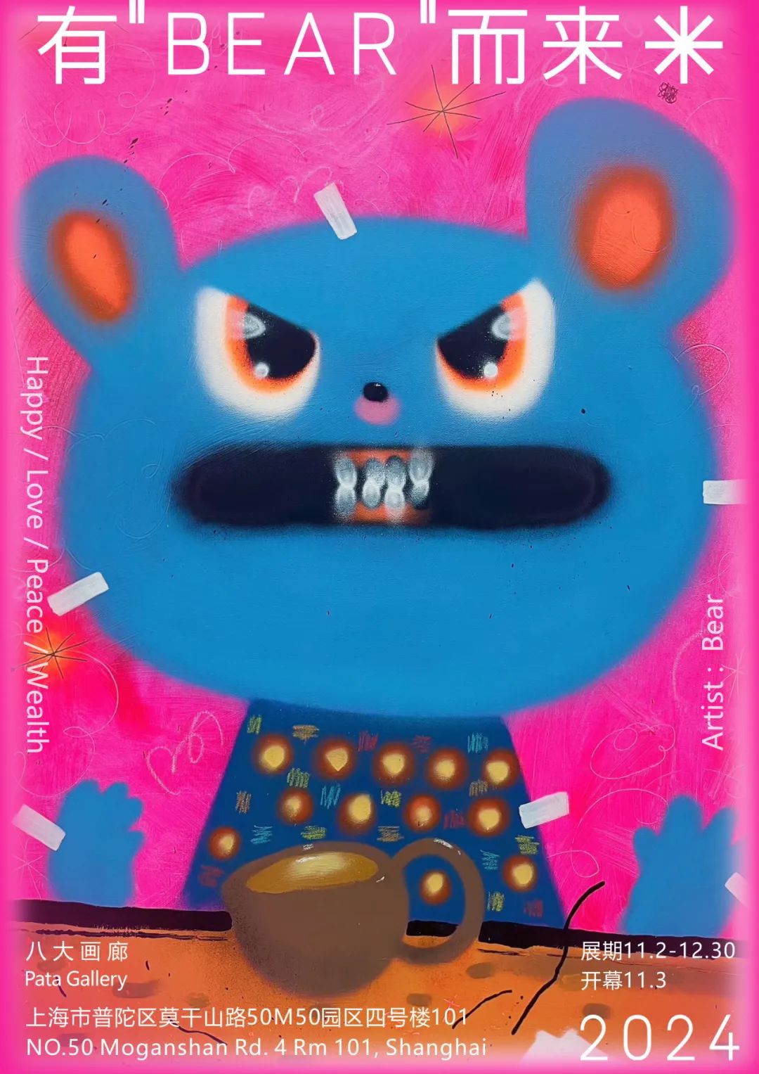 大眼睛、大嘴巴、尖牙齿是“GRIN BEAR”的标志性“熊样”。这个艺术家刘伟雄自2008年起创立的个人IP经历时间的沉淀,从最初穿着熊外套的熊孩子逐渐变成大众熟悉的那只嘴巴大大,长着8颗尖牙的熊。可爱又透着怪诞的咧嘴小熊是艺术家刘伟雄对自己内心的描绘,它也一路见证了艺术家从沉默寡言,总想用犀利外壳保护自己的社恐男孩慢慢成为和熊外壳融为一体,与志同道合的朋友一同追梦的街头艺术家BEAR。为笔下每只小熊设置的丰富情境再现了艺术家对童年时代与伊甸园世界的憧憬,也安静地游走在人们的记忆中,为钢筋混泥土的生活添加了怪诞童趣。