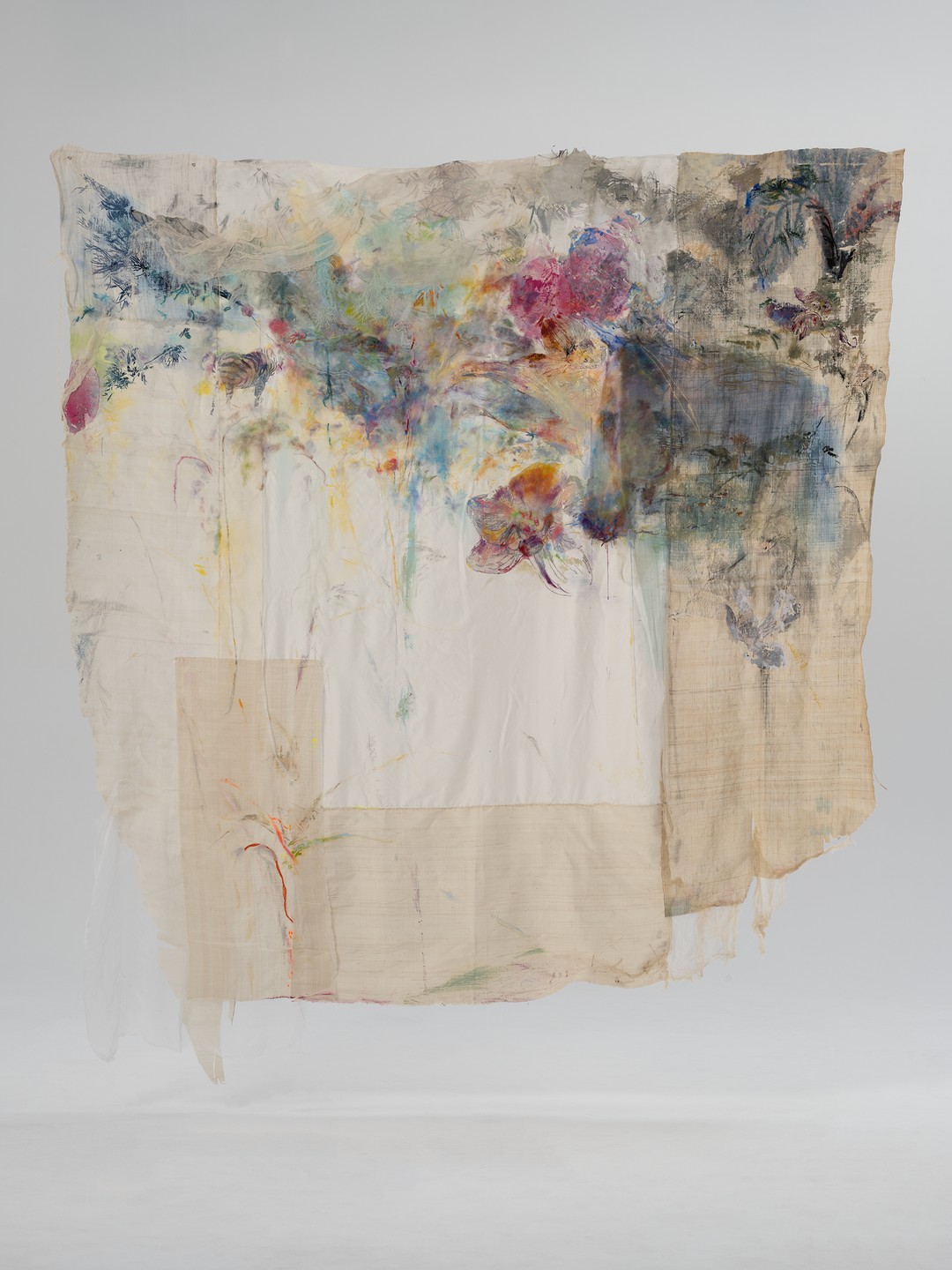 于田田 无论走到哪里 青草和泥土的味道总是一样的, 2024 清代粗绢、清代细绢、桑蚕真丝、纯棉稀疏胚布、手搓麻绳线 、真丝雪纺布条、液态水光纱、蚕丝线、打印纸、丙烯、丙烯媒介剂 、照片转印胶、固体油画颜料、炭笔、铅笔、水粉、苏利羊驼毛手混线、照片转印、丝网印刷 246 x 228 cm