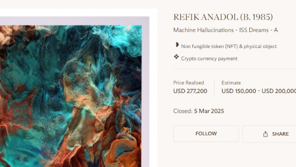根据佳士得的说法,这次展会创收超过 70 万美元(当前约 507.3 万元人民币),许多拍品的最终成交价超出了预期的高估价。最为抢眼的拍品是 Refik Anadol 的《机器幻觉 ——ISS 梦想 ——A》,这幅动态画作利用算法重新诠释了来自国际空间站和卫星的数据,最终以 277200 美元(当前约 200.9 万元人民币)成交。