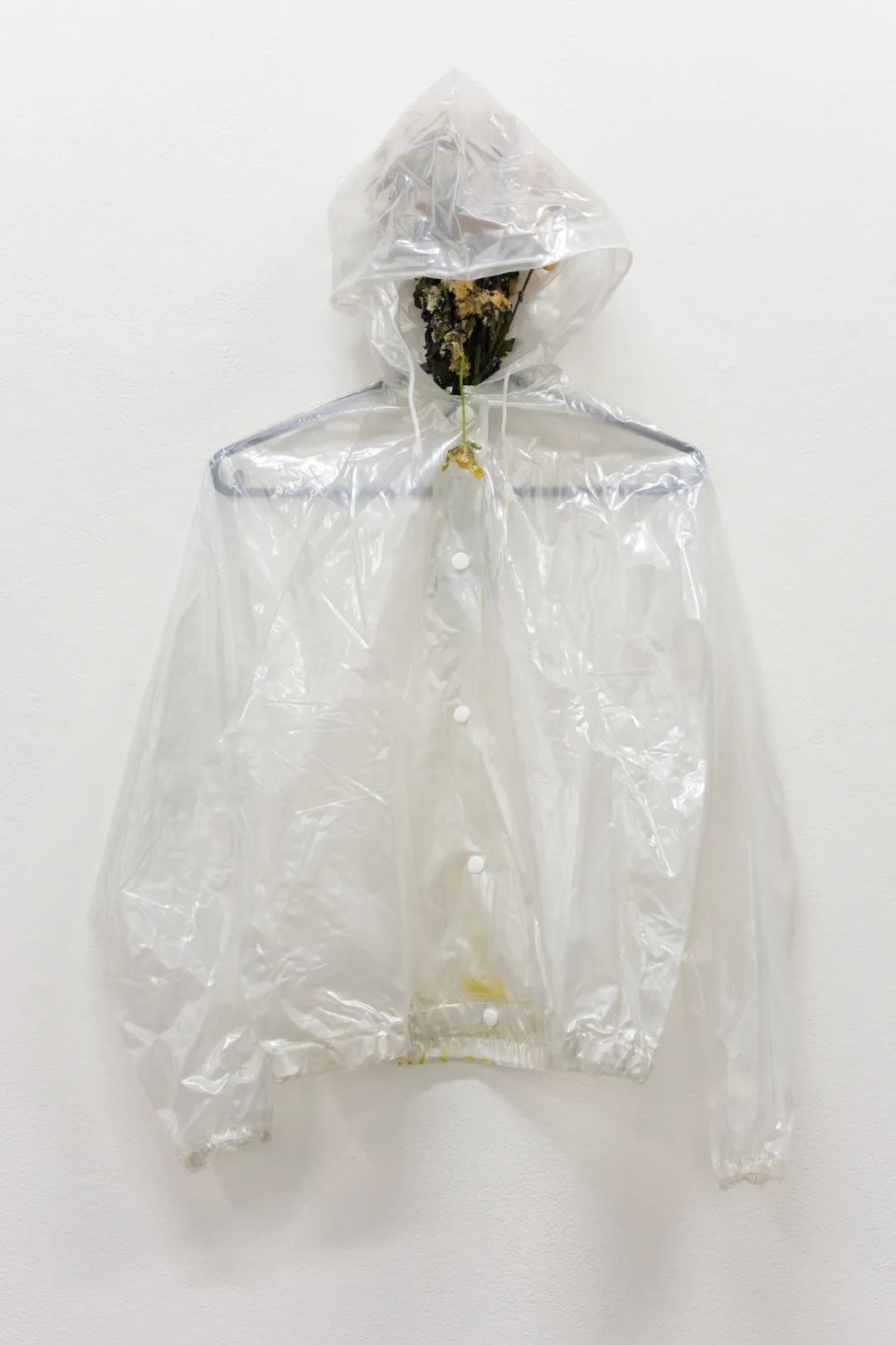 尽管“身体”贯穿于安妮卡·易的艺术创作之中,但她很少直接再现人体形态。在《给GG的出租车先生》中,人体仅通过一件塑料雨衣呈现——呼应了她对透明、保护性材料的频繁运用;头部被一束枯萎腐烂的花束取代,隐喻死亡与哀悼的仪式。通过任由自然环境与细菌力量在展览中持续重塑作品,艺术家挑战了艺术永恒性的传统观念,指向一种后人类状态的潜在可能。