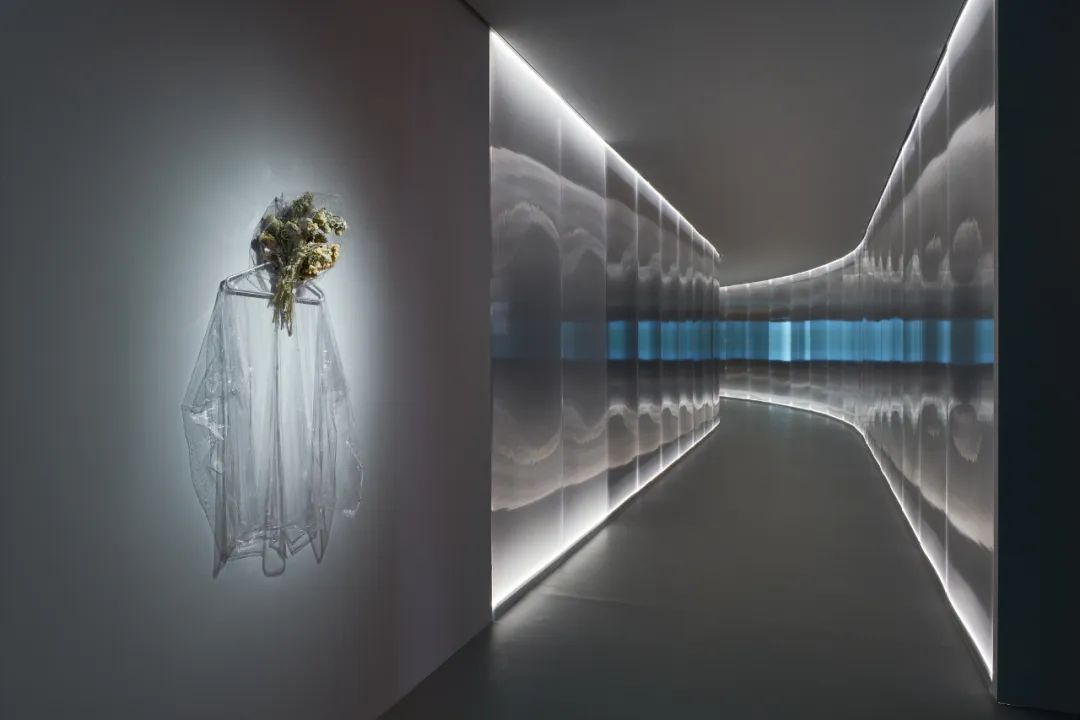 展览空间设计将多个展厅串联,呈现仿佛实验室、太空舱或企业办公环境般的“无菌”场域体验。通过其材质语言,这些环境强化了隔离与共生间的微妙张力,同时为艺术史的梳理与未来可能性的探究提供了思考的空间,与艺术家对流动世界的持续探索形成呼应。作品《给GG的出租车先生》(2012/2025)为本次对安妮卡·易近二十年创作生涯回顾性的展览定下基调,这件早期作品集中体现了她对感官体验、无常以及人类与非人类间模糊边界的关注,而其中蕴含的核心主题与材料语言至今仍在她的艺术实践中持续发酵和演化,这些元素在此次展览中亦得到深入呈现与延伸。