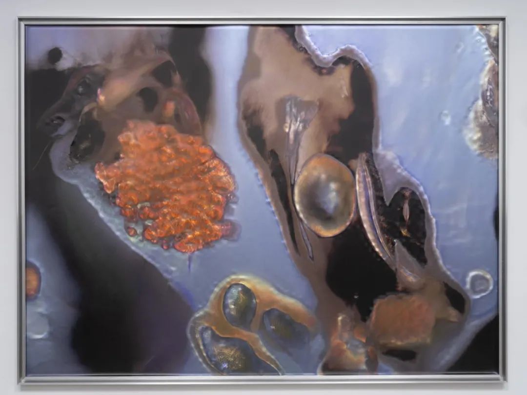 安妮卡·易近年将人工智能作为创作工具与核心主题进行探索。“量子泡沫绘画”系列(2020-2024)记录了她将机器学习技术引入绘画媒介的实验性尝试。系列名称源自理论物理学中的量子泡沫概念——微小粒子与能量波动由于维尔纳·海森堡不确定性原理而自发地出现与消失,使“虚无”在瞬间化为“存在”后又归于沉寂。在这一系列作品中,算法通过吸收艺术家早期作品视觉元素的训练,生成如同血细胞、藻类团簇和起伏的海床的形态。这些元素随后被数字技术层层叠加,构成令人联想到电子生成的外星海洋生物。