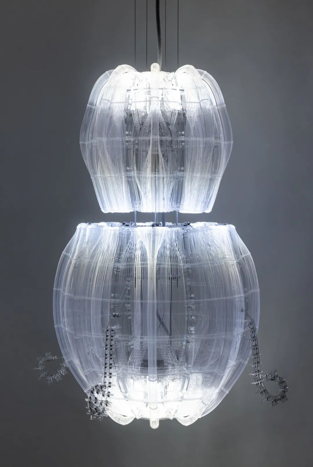 安妮卡·易,《嵌套之肺》,2023-2024,PMMA光纤、LED灯、硅树脂、丙烯酸树脂、环氧树脂、铝、不锈钢、钢材、黄铜、发动机与微型控制器,118.1 × 74.3 × 74.3 cm。©安妮卡·易。图片由艺术家、格莱斯顿画廊和施博尔画廊提供,摄影:安德烈亚·罗塞蒂。