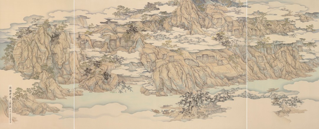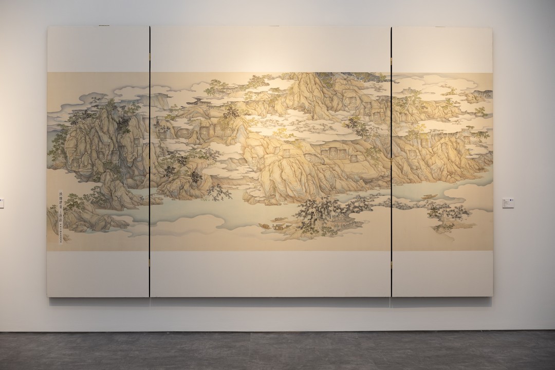 来自中央美术学院的艺术家储嘉,以宋代院体画技法结合现代空间叙事,创作出三面屏绢本设色作品《旃檀海·无上清凉》。她巧妙运用工笔描绘山水奇石,画面间云雾缭绕,历代仕女吹笛弹琴、举杯对饮,仿佛穿越千年。在颠覆传统山水画中以男性为主的视觉叙事的同时,也展现了女性力量的隐喻性表达。