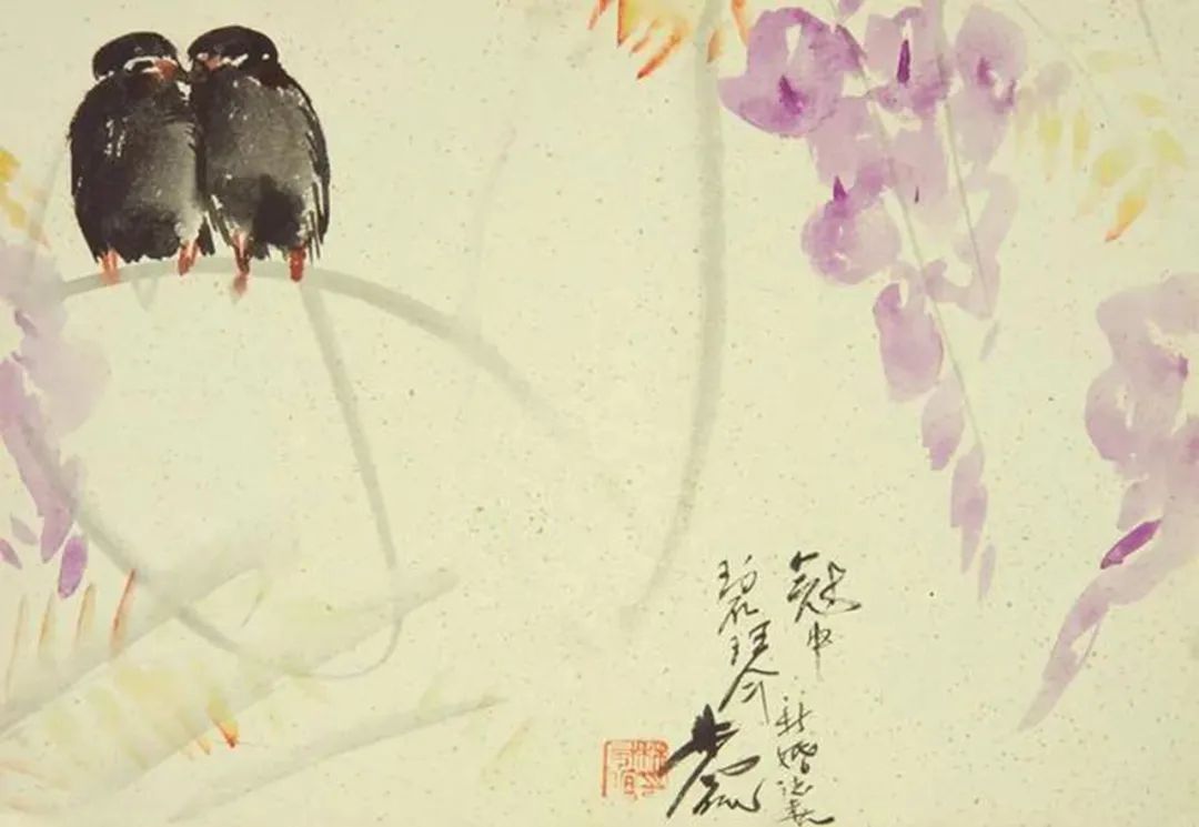 《紫藤双鸟》为林风眠完成于对日抗战胜利隔年——1946年,由重庆返回杭州艺专任教前所作,作品既承载着他迎接抗战胜利的喜悦,亦具重回杭州故地、与妻子团聚的期盼,带有欣欣向荣的深刻寓意。