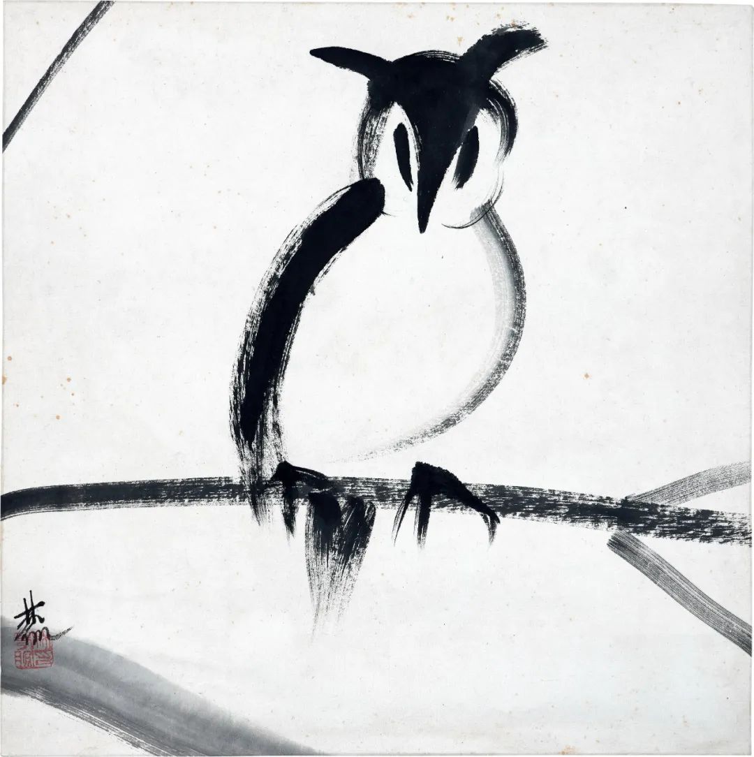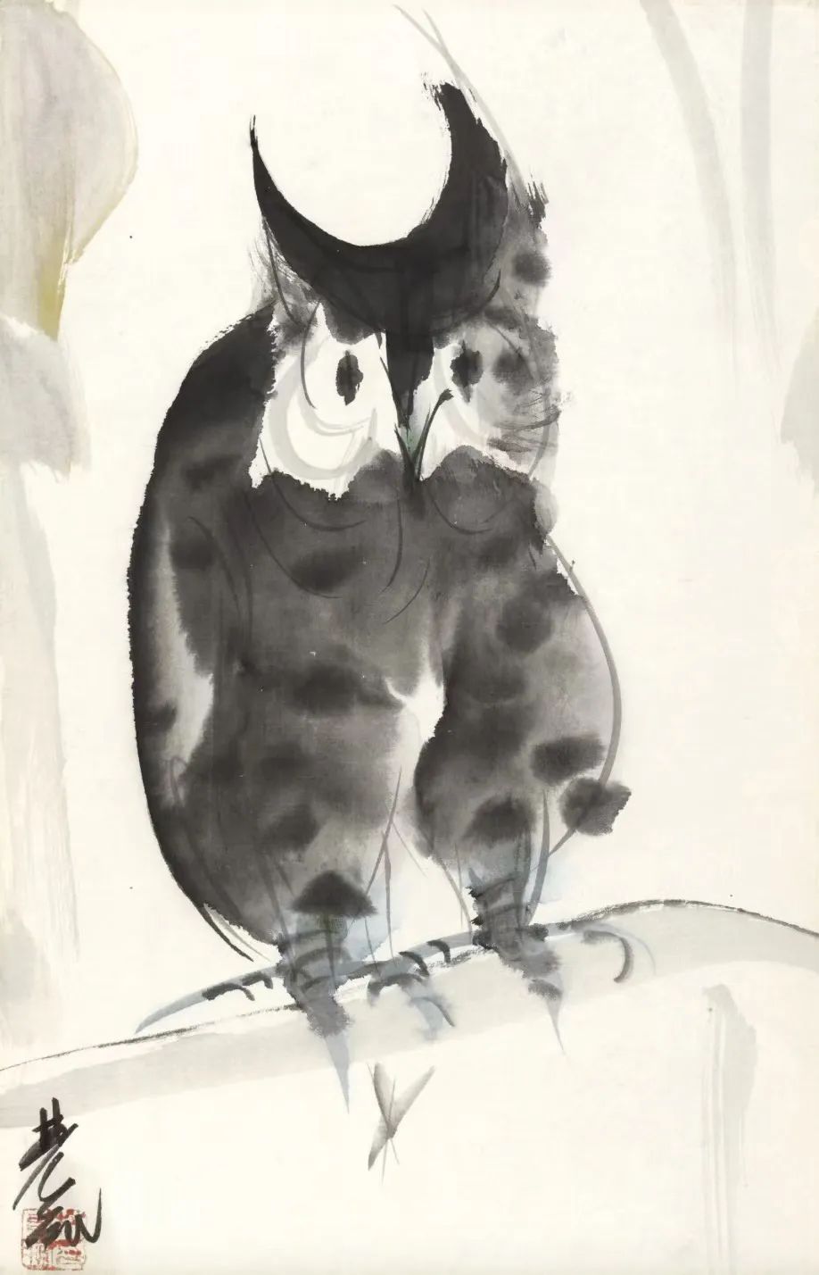 而另一出自林风眠之女林蒂娜旧藏的《猫头鹰》,则领人聚焦单一只鸟禽。作品大胆地以简驭繁,藉由大面积的留白,给予观者投射无限景致的开放性想象。而在中心,林风眠以老辣的劲笔勾勒出单独站立于树梢的孤鸟。当中见其对线条的完美掌控,仅仅透过粗细、轻重、浓淡,便将猫头鹰身体的三维立体感,及形象特征,与其所处环境的关系架构出来,见其多年创作的凝鍊之功。当中,猫头鹰的爪子强而有力地抓住树枝,昂然地立于其上,其翅膀并未鼓动,呈一派轻松地泰若自然,鼓起的胸膛与尖俏的嘴喙、昂扬的头部羽毛,连同黝黑的眼眸,展现了一种若文人风骨的傲然。正如林风眠曾在日记中写道:「画就在于画鸟像人,画花像少女」,猫头鹰亦如林风眠的自画像般,引人怀想,追忆一代大家的不卑不屈,与遗世独立。