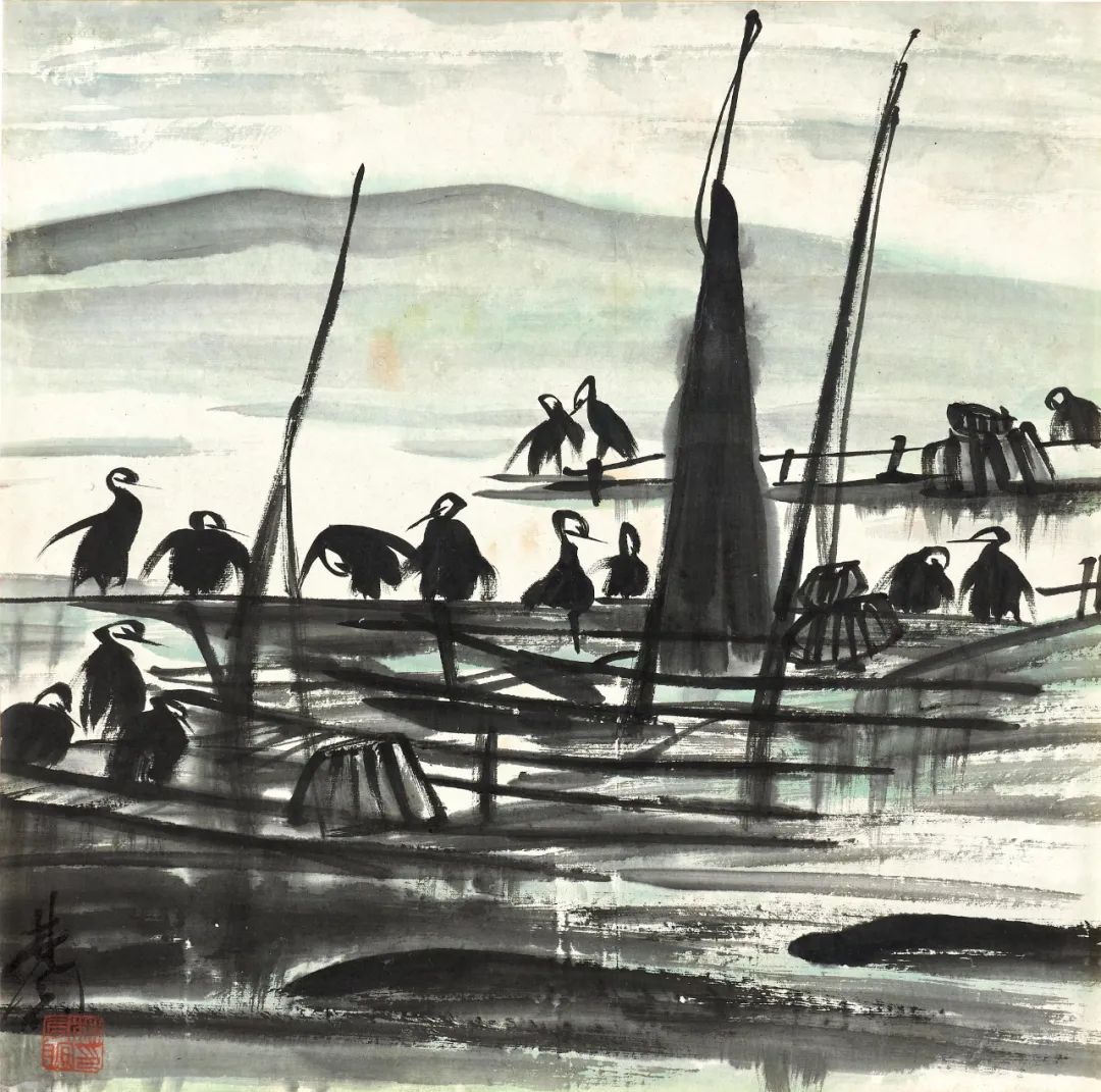「笔简意远」是林风眠风景主题的特色,为展现山水旷远的特质,他在此以墨分五色的形式,收放自如地展现对笔墨干湿浓淡的运用,可谓出神入化。画作背景以淡墨大笔率意横扫,将山、水、天、地表现地分明而又渺远,水面处,则刻意留下枯笔的自然刷痕。而静中之「动」,则来自于身姿活跃、神态皆不同的点点鱼鹰,林风眠以精准如削刻的细笔勾写羽翅和鸟喙,以阔笔墨块展现壮硕身躯。细数其间,共有14只鱼鹰分立于渔舟上,好似乐谱上高、中、低音并奏的音符,而间中直立的桅杆,则如暂停的休止符,与横向的渔舟交织有序。透过遒劲有力的笔触,林风眠令笔下的动物各显神通,深切展现了他对自然和生命最为赤诚、真挚的感悟和体察!