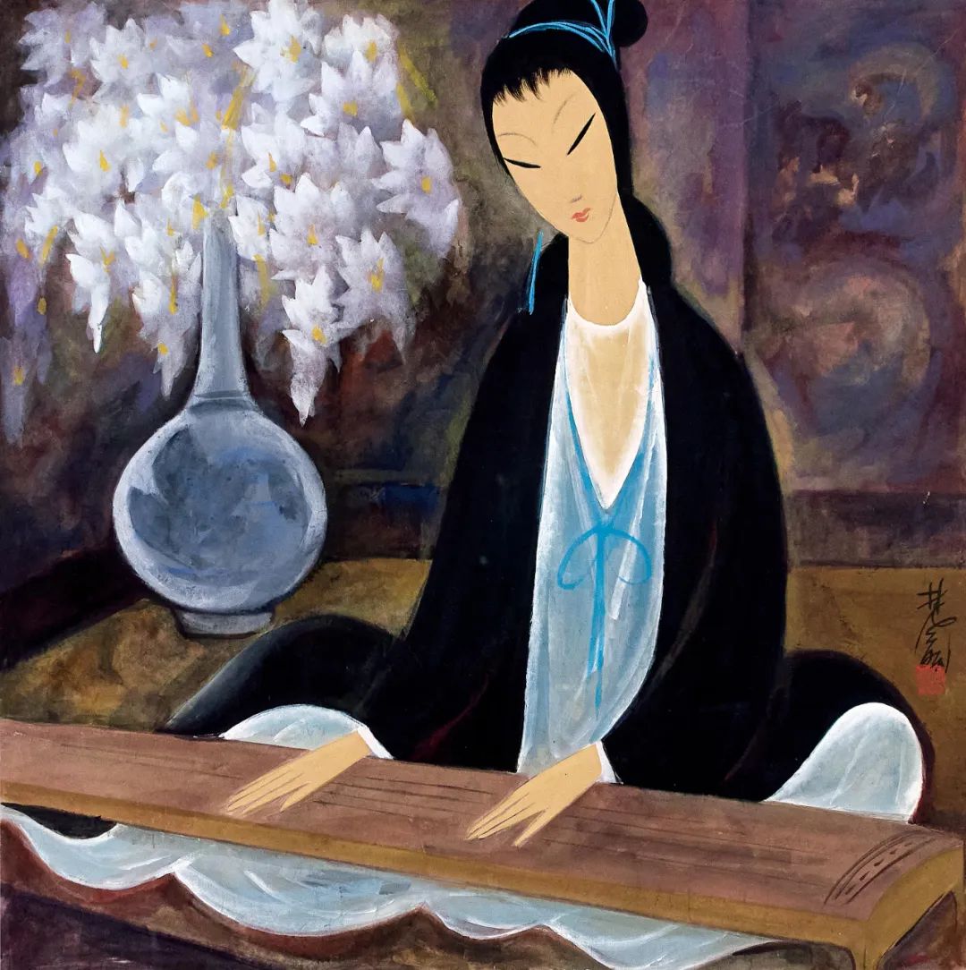 画中仕女侧坐于静室,双手轻按琴弦,满含东方情韵。她标志性的鹅蛋脸与纤细的古典五官,仿若西方雕塑大家布朗库西(Brâncuşi)的《沉睡的缪斯》,孕育着神秘、婉约、妩媚的东方美。而长直的古琴与琴弦,与仕女的纤纤玉指纵横交织,对比着流动的衣带、弧形的身躯线条,亦暗示着人物心绪随乐曲的沉浮。