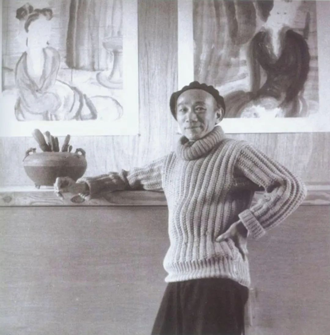 此外,林风眠更以其独创「白线赋光」的勾写,自若隐若现的曲线展现画中人衣裙飘逸、身形从容的意境。仕女身下随双膝起伏的衣裙似化成一朵祥云,承载着画中女子的灵性和神性,似连接起东晋顾恺之《女史箴图》中那紧劲连绵、如春蝉吐丝的线描用笔。林风眠延伸以深浅交织的线条韵律,为画面增添了衣袖生风之灵动,婉若游龙,如见神女归来!