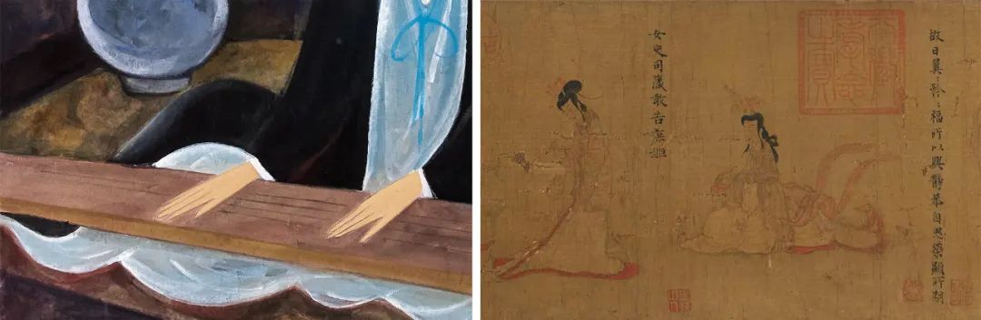 右:顾恺之《女史箴图》(唐代摹本局部),彩墨纸本,24.37×343.75 cm,约5至7世纪作,大英博物馆藏。在林风眠的《抚琴仕女》中,古琴下侧的衣裙宛如一朵祥云,承载着画中女子的灵性和神觉,恰呼应东晋顾恺之《女史箴图》中紧劲连绵、如春蝉吐丝的线描和女子裙摆如莲的体态