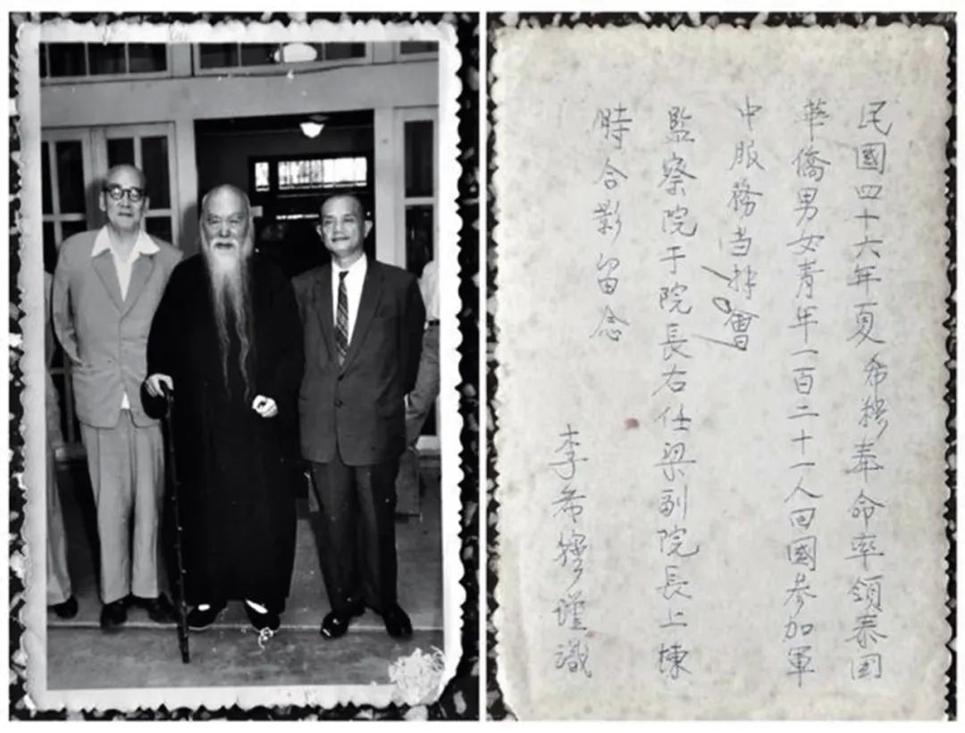 1957年李希穆与于右任、梁上栋合影及背面手书。李希穆为林风眠同乡、泰国华侨,是次上拍的《紫藤双鸟》即为其旧藏