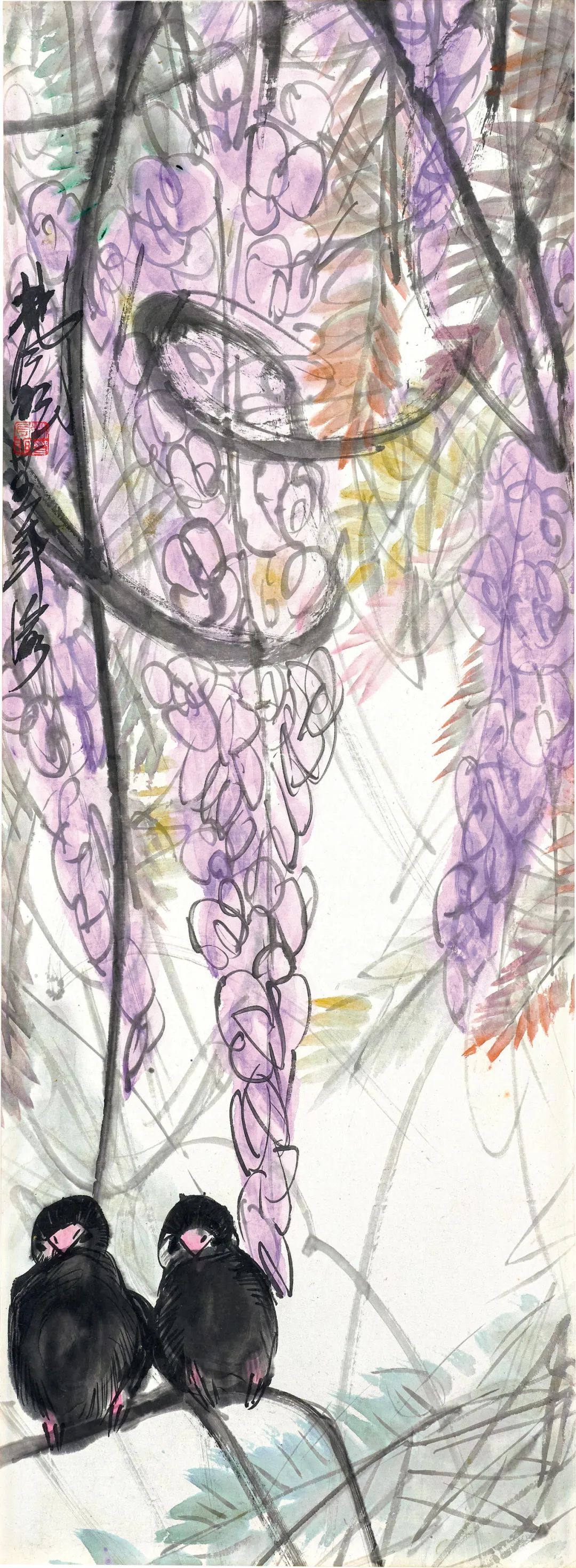 作品采取罕见的直式构图,此形式仅在林风眠1920至1940年代之作常见,足显其珍。林氏以纵贯在线的紫藤为视觉导向,予人一气呵成之感,垂枝如瀑,并稳稳停落于枝头的雀鸟,仿若正轻抚其身,温情满满。而紫藤花朵之形,带着写意的张狂和半抽象的韵味,以圈画法绘就,极尽恣意盎然。